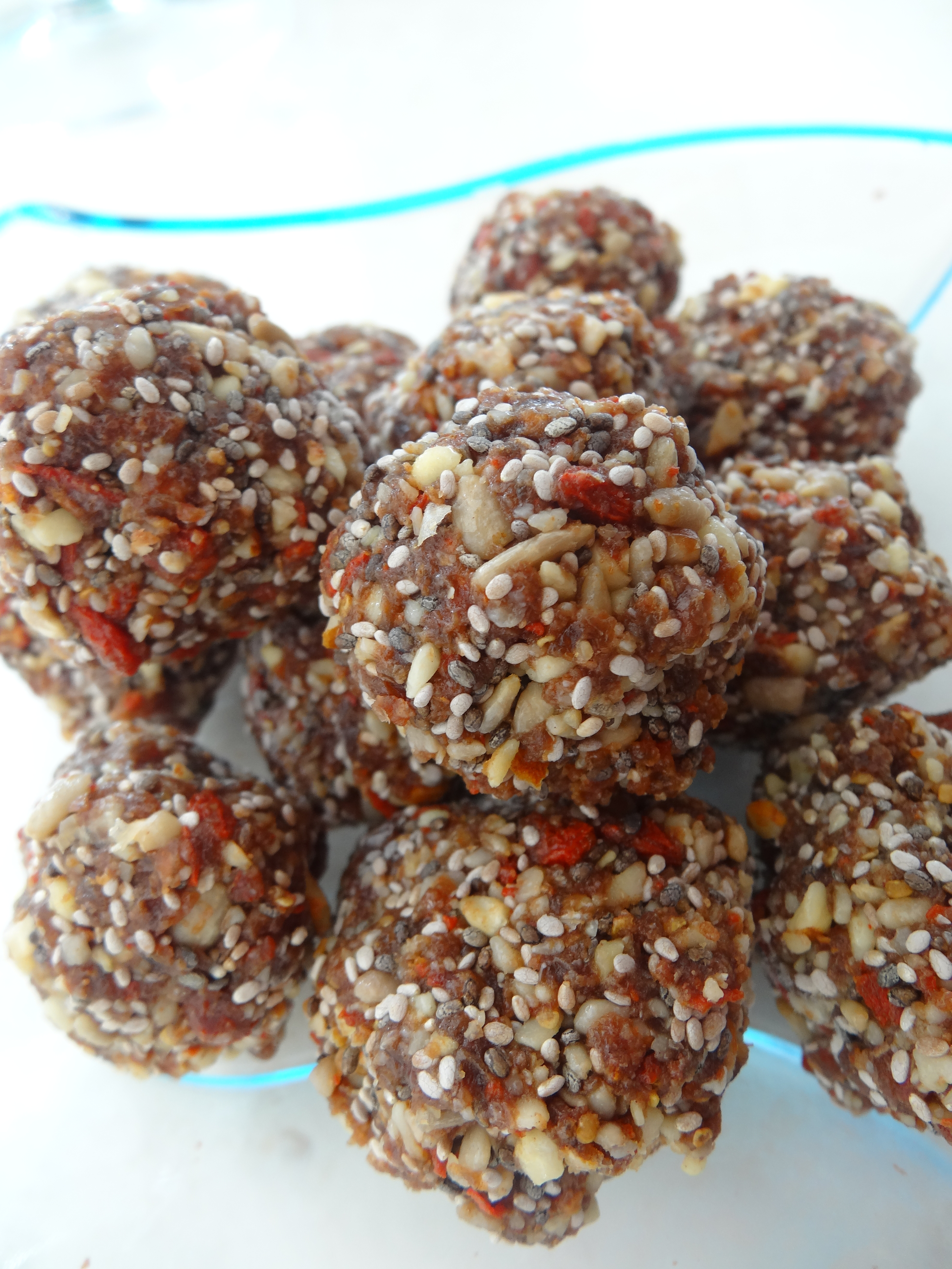 These are my Bliss Balls. I tend to change the recipes adding Goji berries or anything I have in the cupboard. I use Cacao instead of Cocoa because it is unprocessed and in its raw state.